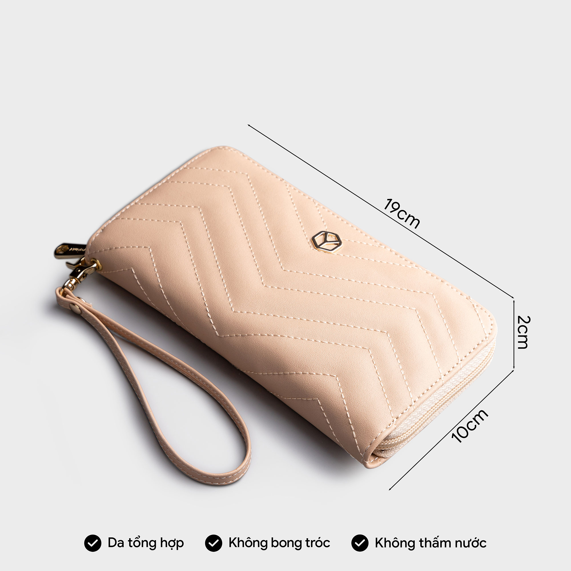 Kích thước: Chiều cao 13.0cm x Chiều ngang 21.0cm x Chiều rộng 4.0cm Ví cầm tay có dây đeo tay tháo rời được Có hai vách ngăn đựng thẻ và điện thoại Dây khóa kéo