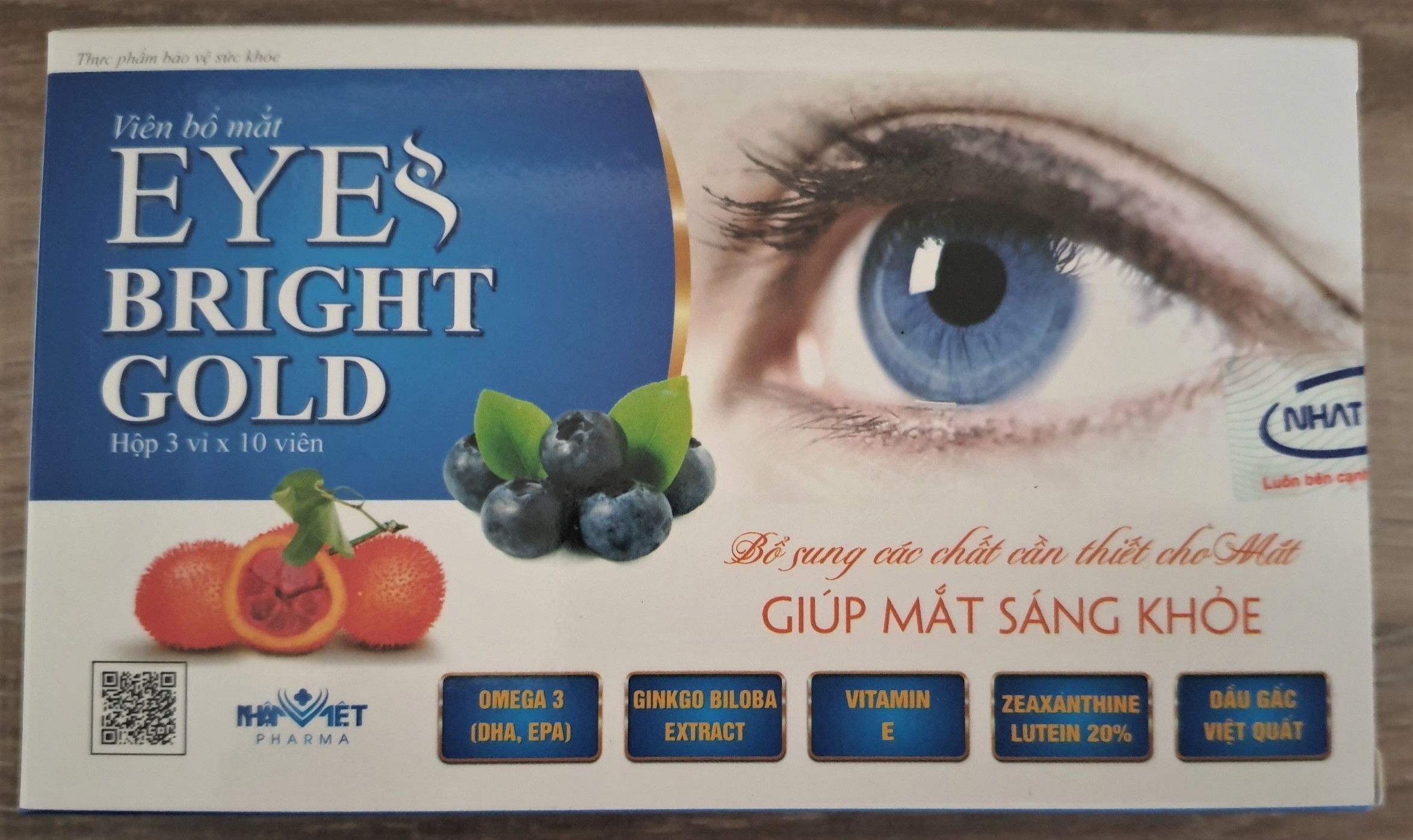 THỰC PHẨM BẢO VỆ SỨC KHỎE VIÊN BỔ MẮT EYES BRIGHT GOLD THÔNG TIN SẢN PHẨM Sản phẩm của CÔNG TY CỔ TMTH NHẬT VIỆT Tên thương hiệu: VIÊN BỔ MẮT EYES BRIGHT GOLD Xuất xứ thương hiệu: Việt Nam Sản xuất tại: Việt Nam Quy cách: Hộp 03 Vỉ x 10 Viên     Thành phần: cho 01 viên nang mềm Dầu gấc 100 mg Việt quất (Tương đương cao việt quất…………) 100 mg Omega 3 (DHA, EPA) 30% 50mg Dầu hạt lanh 30 mg Kẽm Gluconat 25 mg Ginkgo Biloba extract 10 mg β-Caroten 30% 05 mg Lutein 20% 5 mg Zeaxanthin 20% 5 mg Vitamin B6 (Pyridoxin hydroclorid) 1 mg Selen 10 mcg Vitamin E (dl-alpha tocopheryl acetat) 20 IU Phụ liệu: vừa đủ 1 viên vừa đủ 1 viên   Công dụng: Bổ sung các chất cần thiết cho mắt, hỗ trợ làm chậm quá trình lão hóa mắt, hỗ trợ bảo vệ mắt, giúp cải thiện thị lực. Hỗ trợ tình trạng nhức mắt, mỏi mắt, khô mắt, nhìn mờ   Đối tượng sử dụng: