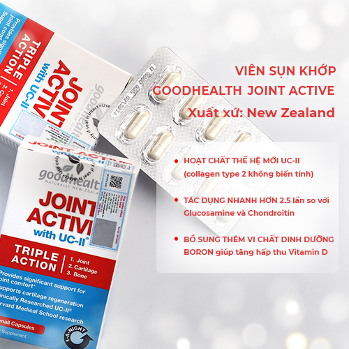 Mua tại TiktokGIỚI THIỆU SẢN PHẨM GOODHEALTH JOINT ACTIVE Viên sụn khớp Goodhealth Joint Active: Hộp 30 viên nang Sản phẩm Joint Active được nhập khẩu chính hãng từ Good Health New Zealand - thương hiệu nổi tiếng về các sản phẩm bảo vệ sức khỏe có nguồn gốc từ tự nhiên. UC-II được chiết xuất hoàn toàn từ sụn ức gà nên đảm bảo lành tính, an toàn cho người sử dụng. Dựa theo các nghiên cứu lâm sàng cho đến nay chưa ghi nhận tác dụng phụ nào từ UC-II cho những người gặp vấn đề về xương sụn khớp. ƯU ĐIỂM NỔI BẬT Bổ sung hoạt chất thế hệ mới UC-II (Collagen type 2 không biến tính) UC-II (collagen type 2 không biến tính) trong thành phần của Viên sụn khớp Joint Active là hoạt chất thế hệ mới đã được nghiên cứu và kiểm định lâm sàng bởi Đại học Y khoa Harvard mang lại hiệu quả rõ rệt trong việc nuôi dưỡng và phục hồi sụn khớp bị tổn thương, tăng tiết dịch khớp trong trường hợp khô khớp, giúp giảm viêm, giảm đau và ngăn ngừa thoái hóa khớp. Viên sụn khớp Joint Active hiện đang nhận được nhiều phản hồi tích cực từ những người gặp vấn đề về sụn khớp như dân văn phòng, người chơi thể thao và đặc biệt là người cao tuổi. Cơ chế 3 tác động Thành phần trong viên sụn khớp Joint Active được kết hợp với mục đích các chất bổ trợ nhau, giúp tăng cường hiệu quả của các chất còn lại. Thông qua đường uống, Collagen tuýp II không biến tính bổ sung Collagen tại các sụn khớp, giúp giảm đau, tái tạo và nuôi dưỡng sụn khớp. Một phần UC-II được hấp thu còn giúp điều chỉnh đáp ứng miễn dịch, bảo vệ sụn khớp, hỗ trợ làm chậm quá trình thoái hóa khớp. Bên cạnh đó, Vitamin D trong Joint Active giúp hấp thụ canxi và phospho phòng tránh loãng xương, bảo vệ xương dưới sụn giúp ngăn ngừa thoái hóa sụn. Đặc biệt, Joint Active còn được bổ sung thêm Boron – vi chất dinh dưỡng giúp hấp thụ vitamin D, làm tăng mật độ xương giúp xương chắc khỏe, chống viêm, giảm viêm khớp, ngăn ngừa loãng xương. Tác dụng và hiệu quả nhanh hơn Hợp chất UC-II được đã được nghiên cứu, kiểm định lâm sàng bởi Đại học Y khoa Harvard an toàn và hiệu quả gấp 2,3 lần so với Glucosamine và Chondroitin. Trên Tạp chí International Journal of Medical Science, nghiên cứu được đăng tải của tác giả David C. Crowley cũng cho thấy Collagen tuýp II không biến tính giúp hỗ trợ giảm tình trạng cứng khớp và khó vận động là 33%, hỗ trợ giảm tình trạng đau nói chung đến 44%, chỉ trong 90 ngày. Không tác dụng phụ Các hoạt chất đều nghiên cứu ở hàm lượng an toàn, không gây ảnh hưởng tới tiêu hóa hay bất kì tác dụng phụ nào, hoàn toàn có thể sử dụng lâu dài. THÀNH PHẦN CỦA VIÊN SỤN KHỚP JOINT ACTIVE Trong mỗi viên Goodhealth Joint Active có chứa: Thành phần (cho 1 viên)