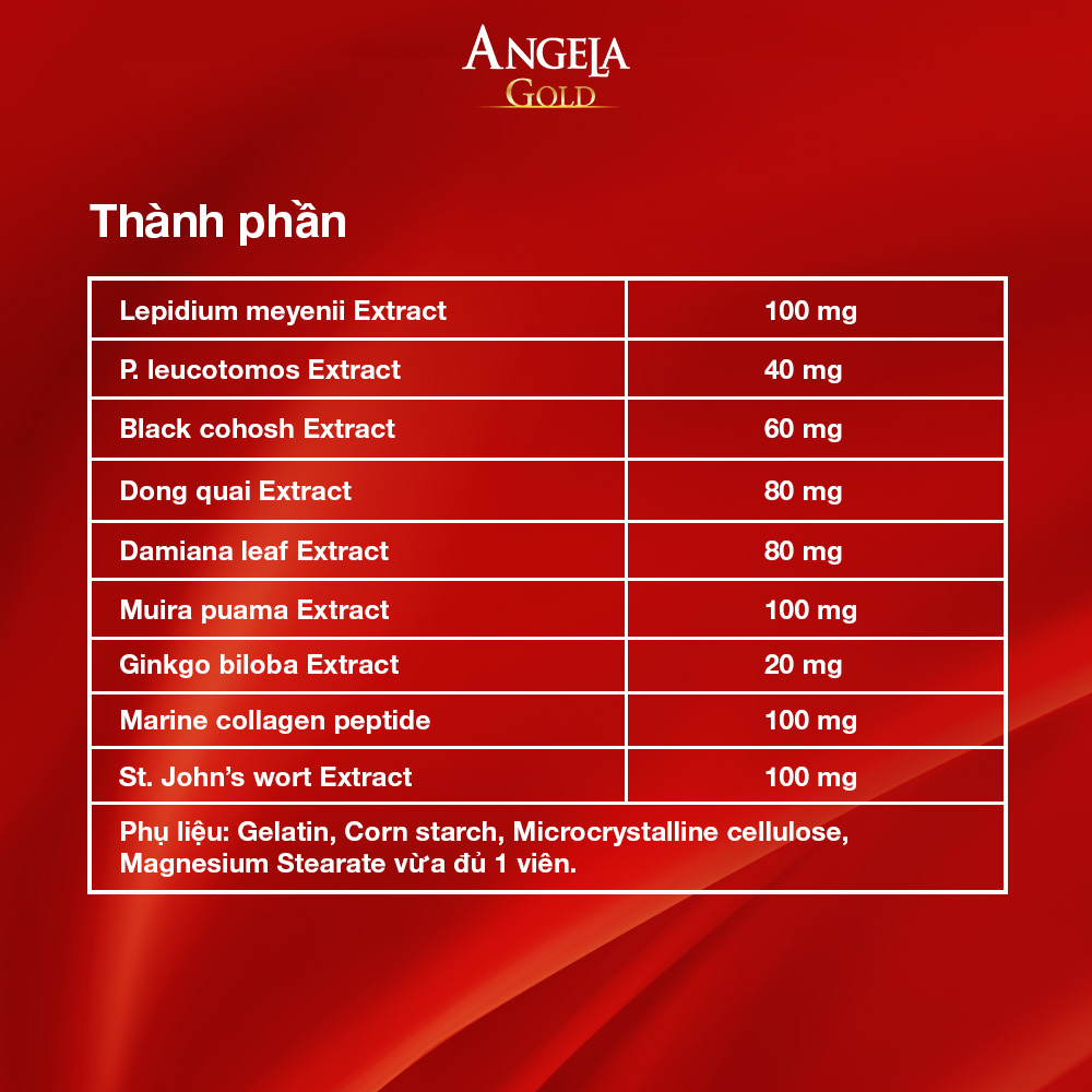 - THÀNH PHẦN ANGELA GOLD Angela Gold có nguồn gốc 100% từ thiên nhiên, được tinh chiết bằng công nghệ hiện đại của Mỹ. Thành phần chính là Lepidium Meyenii và tinh chất chuyên biệt dành cho da P. Leucotomos, cùng các thảo dược quý khác như Muira Puama, Dong Quai, Damiana Leaf, Ginkgo Biloba, Marine collagen peptide, St. John’s Wort.