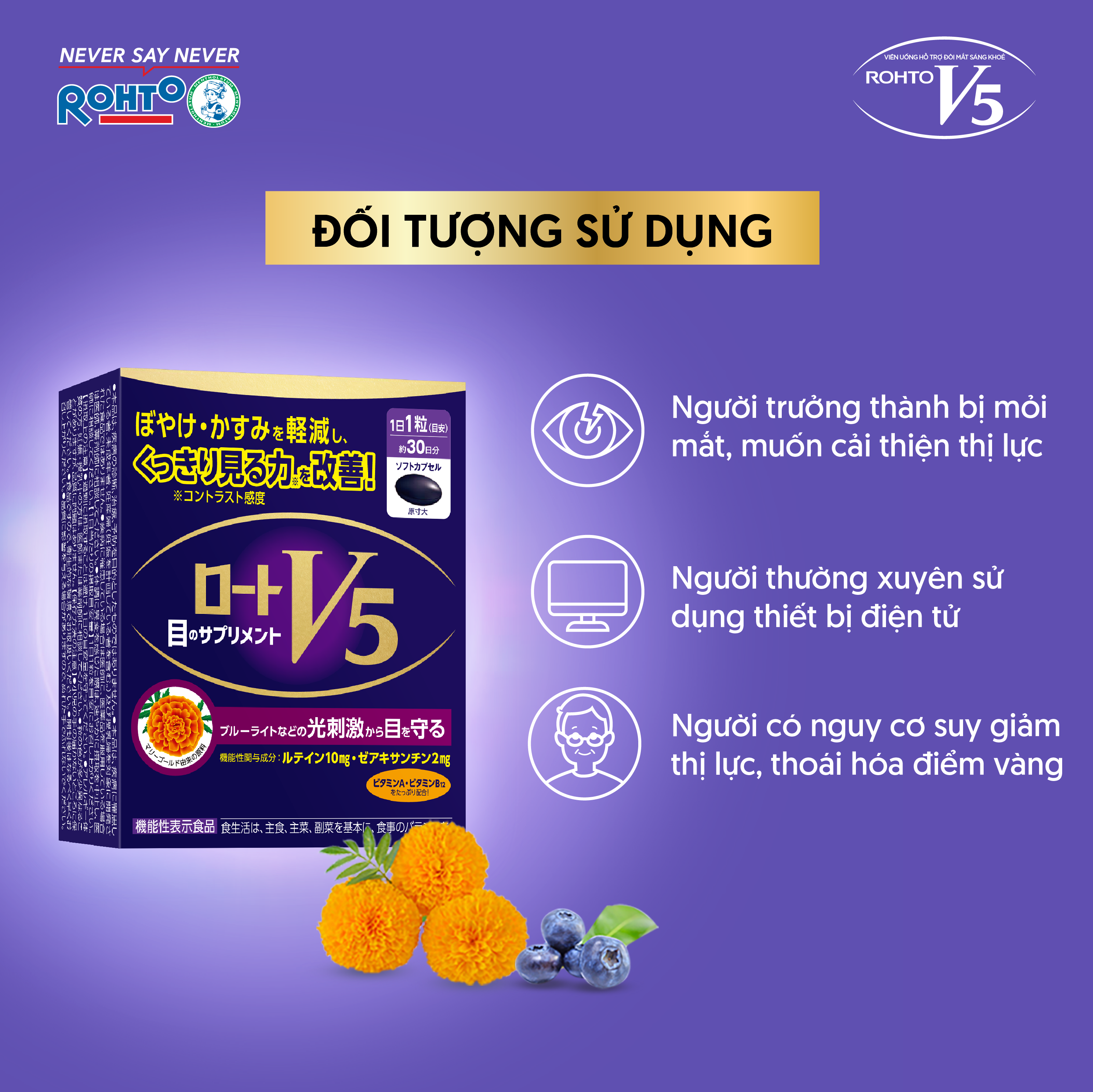 Với kinh nghiệm hơn 150 năm nghiên cứu và phát triển các dòng sản phẩm chăm sóc mắt, lần đầu tiên tại Việt Nam, Rohto ra mắt dòng sản phẩm chăm sóc mắt sáng khỏe và cải thiện thị lực: Viên uống bổ mắt Rohto V5 với Lutein & Zeaxanthin giúp bảo vệ võng mạc, giảm nguy cơ thoái hóa điểm vàng, cải thiện tầm nhìn và duy trì đôi mắt sáng khỏe tinh anh.