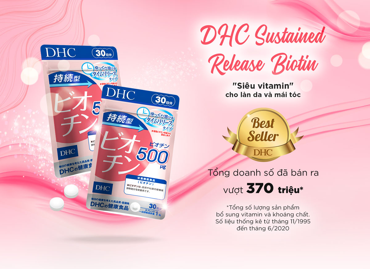 Viên Uống DHC Biotin Ngăn Rụng Tóc Sustained Release Biotin 30 Ngày (30 Viên) Viên Uống DHC Biotin Ngăn Rụng Tóc Sustained Release Biotin 30 Ngày (30 Viên) THÔNG TIN CHUNG: Biotin là một loại chất dinh dưỡng thiết yếu được phân loại vào nhóm vitamin B và còn được gọi là "vitamin H" hoặc "vitamin B7", đóng các vai trò khác nhau trong cơ thể như chuyển hóa đường, lipid và axit amin. Đặc biệt, biotin tham gia vào việc duy trì sức khỏe làn da, niêm mạc, sự phát triển của móng tay và tóc. Nếu thiếu biotin thì cơ thể sẽ xuất hiện các triệu chứng về da như da dị ứng và rụng tóc. Vì biotin có trong nhiều loại thực phẩm và cũng được tạo ra bởi vi khuẩn đường ruột nên về cơ bản đây là một chất dinh dưỡng hiếm khi bị thiếu hụt. Tuy nhiên, lối sống không đều đặn, thói quen ăn uống không cân bằng sẽ làm lượng biotin giảm đi. Ngoài ra, vì biotin tan trong nước nên nó sẽ nhanh chóng được đào thải ra khỏi cơ thể sau khi uống. Sản phẩm bổ sung 500μg biotin mỗi ngày giúp bạn có mái tóc và làn da khỏe đẹp. Theo hướng dẫn lượng hằng ngày. THÀNH PHẦN Đường bột (sản xuất tại Nhật Bản)/cellulose, hydroxypropyl methylcellulose, Ca stearate, silicon dioxide mịn, biotin. CÔNG DỤNG Mọc tóc, đẹp da, tăng cường thể lực, ngừa rụng tóc do dị ứng, viêm da cơ địa. ĐỐI TƯỢNG SỬ DỤNG Những người muốn duy trì sức khỏe của tóc và da Những người muốn bổ sung hàm lượng biotin hiệu quả Những người không thể dùng bổ sung biotin thường xuyên qua bữa ăn hằng ngày. Lưu ý: