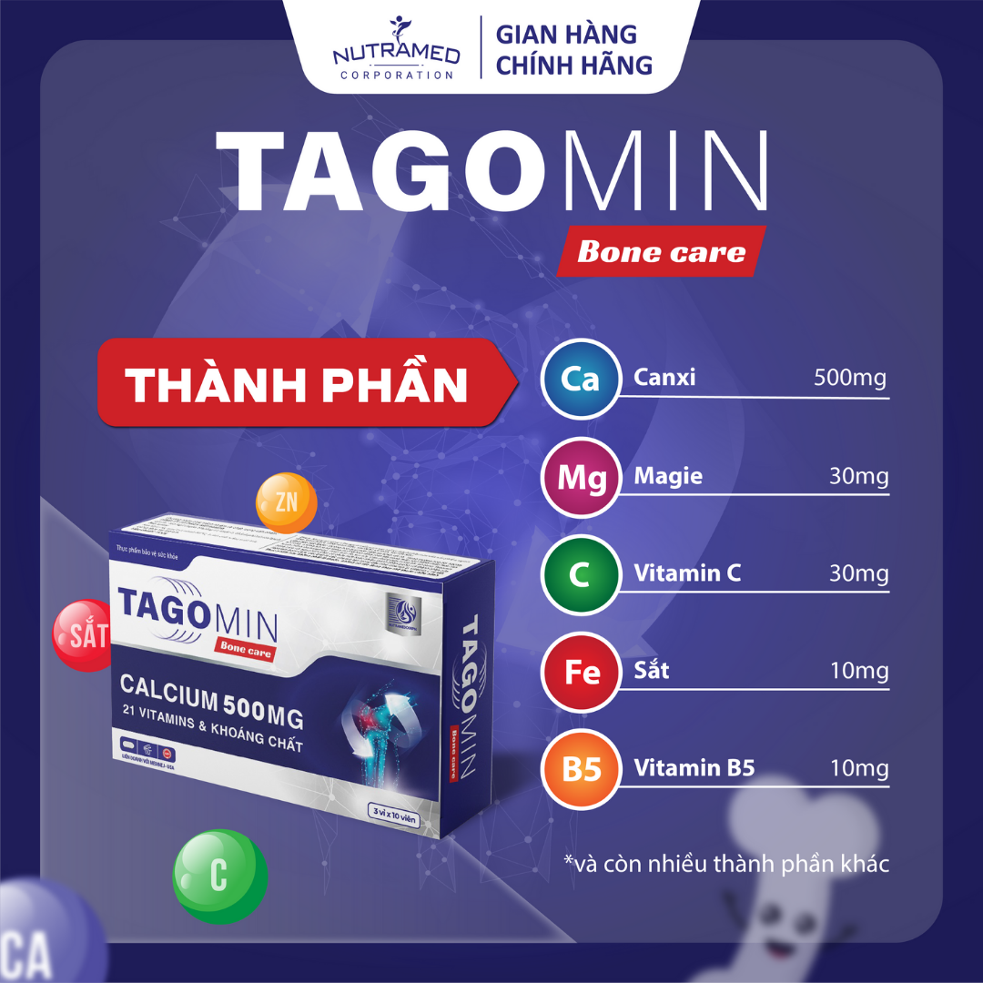TAGOMIN - HỖ TRỢ XƯƠNG CHẮC KHỎE. CẢI THIỆN TÌNH TRẠNG CÒI XƯƠNG. GIẢM NGUY CƠ LOÃNG XƯƠNG THÀNH PHẦN ️Canxi (Calcium carbonate), Magie (Magnesium oxide), Vitamin C (Ascorbic acid), Sắt (sắt carbonyl), Vitamin B5 (D-Calcium pantothenate),Kẽm (kẽm sulfate monohydrate), Vitamin B3 (Nicotinamide), Myo-Inositol, Vi tảo Schizochytrium,Vitamin B6 (Pyridoxin hydrochlorid),Manga (manga sulfate monohydrate),Vitamin B2 (Riboflavin), Vitamin B1 (Thiamin hydrochlorid),Đồng (Copper gluconate), Bột beta caroten, Folic acid (Calci - L - methyl - folat),Iốt (Iod kali iodid), Vitamin K1 (Phytomenadione), Biotin (D - biotin), Selen (Natri selenite), Crom (crom picolinat),Vitamin D3 (Cholecalciferol), Vitamin E (D-alpha tocopheryl acetate), Vitamin B12 (Cyanocobalamin).   CÔNG DỤNG    ️Giúp bổ sung canxi, vitamin D3, các vitamin và khoáng chất cho cơ thể, hỗ trợ xương chắc khỏe, hỗ trợ phát triển chiều cao ở trẻ, cải thiện tình trạng còi xương ở trẻ, giảm nguy cơ loãng xương ở người lớn.   ĐỐI TƯỢNG SỬ DỤNG  ️ Trẻ còi xương và chậm mọc răng, thanh thiếu niên đang trong giai đoạn phát triển chiều cao và nhu cầu bổ sung canxi. ️Phụ nữ chuẩn bị mang thai, đang mang thai, cho con bú, đang tuổi tiền mãn kinh thiếu hụt canxi cần bổ sung canxi. ️Người có tuổi bổ sung xương hoặc nguy cơ bị loãng xương do thiếu canxi.   HƯỚNG DẪN SỬ DỤNG  ️ Uống 1 viên/lần mỗi ngày.  ️ Uống trước hoặc sau khi sử dụng thuốc hoặc sản phẩm bổ trợ khác vài giờ. ️Uống lúc no.   KHÔNG SỬ DỤNG TRONG TRƯỜNG HỢP  ️ Người mẫn cảm với bất kỳ thành phần nào của sản phẩm.  ️Người tăng canxi huyết, tăng canxi niệu, người bị sỏi thận, sỏi tiết niệu.  ️Người bị tăng chất sắt trong máu như bệnh thalassemia, thiếu máu do suy tủy   LƯU Ý ️ Trường hợp quá mẫn cảm đã từng xảy ra. Trong trường hợp đó, ngưng sử dụng. ️Cần chú ý không trộn lẫn sử dụng Tagomin bone care với sản phẩm khác có canxi hoặc thành phần giống với thành phần của Tagomin bone care, đặc biệt là các vitamin tan trong dầu như  D, E và sắt ️Thực phẩm này không phải là thuốc, không có tác dụng thay thế thuốc chữa bệnh.   BẢO QUẢN   ️ Nơi khô ráo, nhiệt độ dưới 30°C, tránh ánh sáng mặt trời. ️Để xa tầm tay trẻ em.   THÔNG TIN SẢN PHẨM Tên sản phẩm: TAGOMIN BONE CARE TAGOMIN - HỖ TRỢ XƯƠNG CHẮC KHỎE. CẢI THIỆN TÌNH TRẠNG CÒI XƯƠNG. GIẢM NGUY CƠ LOÃNG XƯƠNG THÀNH PHẦN ️Canxi (Calcium carbonate), Magie (Magnesium oxide), Vitamin C (Ascorbic acid), Sắt (sắt carbonyl), Vitamin B5 (D-Calcium pantothenate),Kẽm (kẽm sulfate monohydrate), Vitamin B3 (Nicotinamide), Myo-Inositol, Vi tảo Schizochytrium,Vitamin B6 (Pyridoxin hydrochlorid),Manga (manga sulfate monohydrate),Vitamin B2 (Riboflavin), Vitamin B1 (Thiamin hydrochlorid),Đồng (Copper gluconate), Bột beta caroten, Folic acid (Calci - L - methyl - folat),Iốt (Iod kali iodid), Vitamin K1 (Phytomenadione), Biotin (D - biotin), Selen (Natri selenite), Crom (crom picolinat),Vitamin D3 (Cholecalciferol), Vitamin E (D-alpha tocopheryl acetate), Vitamin B12 (Cyanocobalamin).   CÔNG DỤNG    ️Giúp bổ sung canxi, vitamin D3, các vitamin và khoáng chất cho cơ thể, hỗ trợ xương chắc khỏe, hỗ trợ phát triển chiều cao ở trẻ, cải thiện tình trạng còi xương ở trẻ, giảm nguy cơ loãng xương ở người lớn.   ĐỐI TƯỢNG SỬ DỤNG  ️ Trẻ còi xương và chậm mọc răng, thanh thiếu niên đang trong giai đoạn phát triển chiều cao và nhu cầu bổ sung canxi. ️Phụ nữ chuẩn bị mang thai, đang mang thai, cho con bú, đang tuổi tiền mãn kinh thiếu hụt canxi cần bổ sung canxi. ️Người có tuổi bổ sung xương hoặc nguy cơ bị loãng xương do thiếu canxi.   HƯỚNG DẪN SỬ DỤNG  ️ Uống 1 viên/lần mỗi ngày.  ️ Uống trước hoặc sau khi sử dụng thuốc hoặc sản phẩm bổ trợ khác vài giờ. ️Uống lúc no.   KHÔNG SỬ DỤNG TRONG TRƯỜNG HỢP  ️ Người mẫn cảm với bất kỳ thành phần nào của sản phẩm.  ️Người tăng canxi huyết, tăng canxi niệu, người bị sỏi thận, sỏi tiết niệu.  ️Người bị tăng chất sắt trong máu như bệnh thalassemia, thiếu máu do suy tủy   LƯU Ý ️ Trường hợp quá mẫn cảm đã từng xảy ra. Trong trường hợp đó, ngưng sử dụng. ️Cần chú ý không trộn lẫn sử dụng Tagomin bone care với sản phẩm khác có canxi hoặc thành phần giống với thành phần của Tagomin bone care, đặc biệt là các vitamin tan trong dầu như  D, E và sắt ️Thực phẩm này không phải là thuốc, không có tác dụng thay thế thuốc chữa bệnh.   BẢO QUẢN   ️ Nơi khô ráo, nhiệt độ dưới 30°C, tránh ánh sáng mặt trời. ️Để xa tầm tay trẻ em.   THÔNG TIN SẢN PHẨM Tên sản phẩm: TAGOMIN BONE CARE Quy cách đóng gói: Hộp 3 vỉ x 10 viên Hạn sử dụng: 36 tháng kể từ ngày sản xuất. Tiêu chuẩn: TCCS   _ NUTRAMED - KHƠI NGUỒN KHOA HỌC TỚI CUỘC SỐNG   Nhà máy đạt chuẩn WHO – GMP. Nguyên liệu được kiểm tra chất lượng khắt khe bởi nhà máy đạt chuẩn GMP.