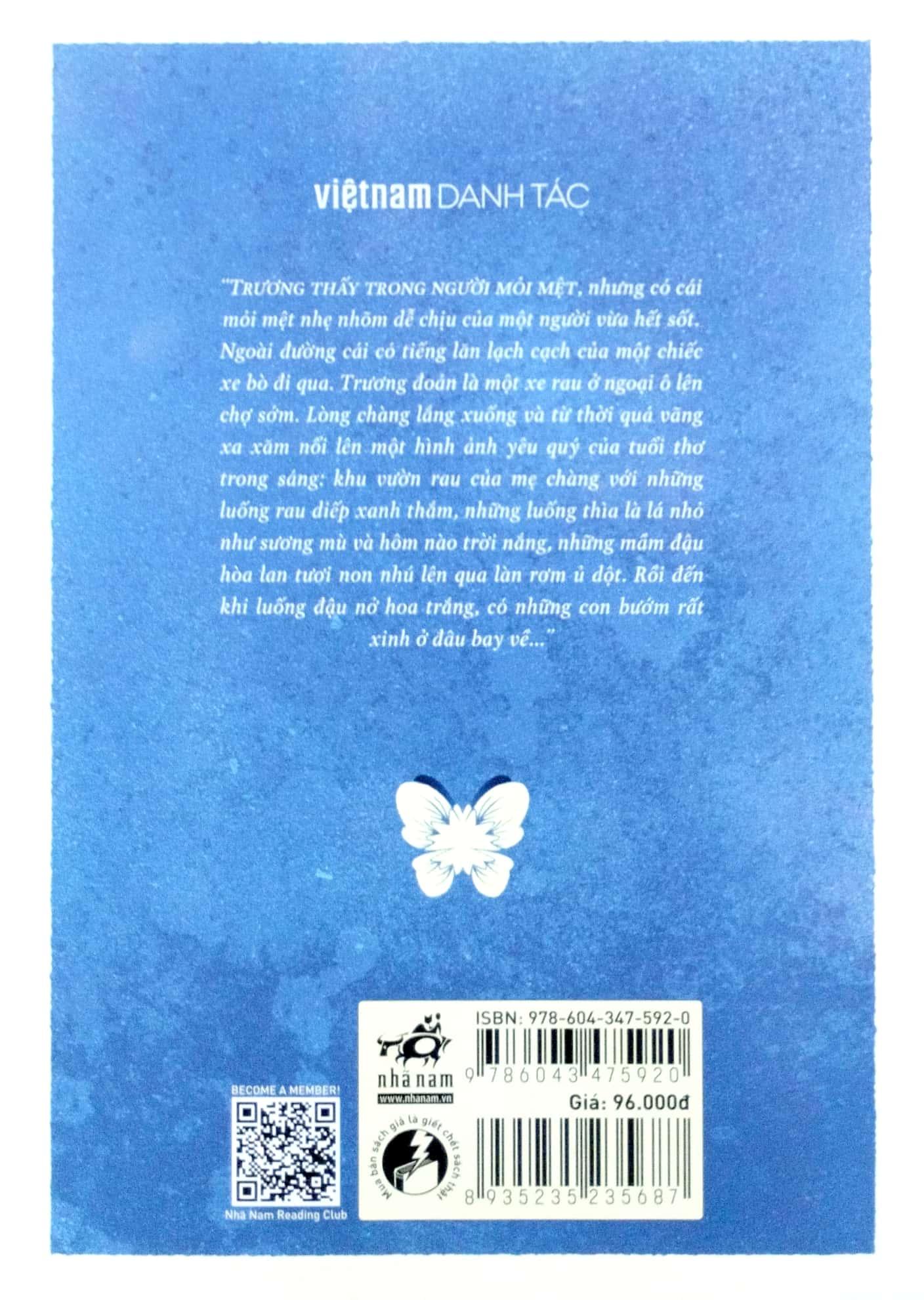 "TRƯƠNG THẤY TRONG NGƯỜI MỎI MỆT, nhưng có cái mỏi mệt nhẹ nhõm dễ chịu của một người vừa hết sốt. Ngoài đường cái có tiếng lăn lạch tạch của một chiếc xe bò đi qua. Trương đoán là một xe rau ở ngoại ô lên chợ sớm. Lòng chàng lắng xuống và từ thời quá vãng xa xăm nổi lên một hình ảnh yêu quý của tuổi thơ trong sáng: khu vườn rau của mẹ chàng với những luống rau diếp xanh thắm, những luống thìa là lá nhỏ như sương mù và hôm nào trời nắng, những mầm đậu hòa lan tươi non nhú lên qua làn rơm ủ dột. Rồi đến khi luống đậu nở hoa trắng, có những con bướm rất xinh ở đâu bay về"