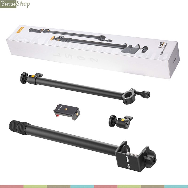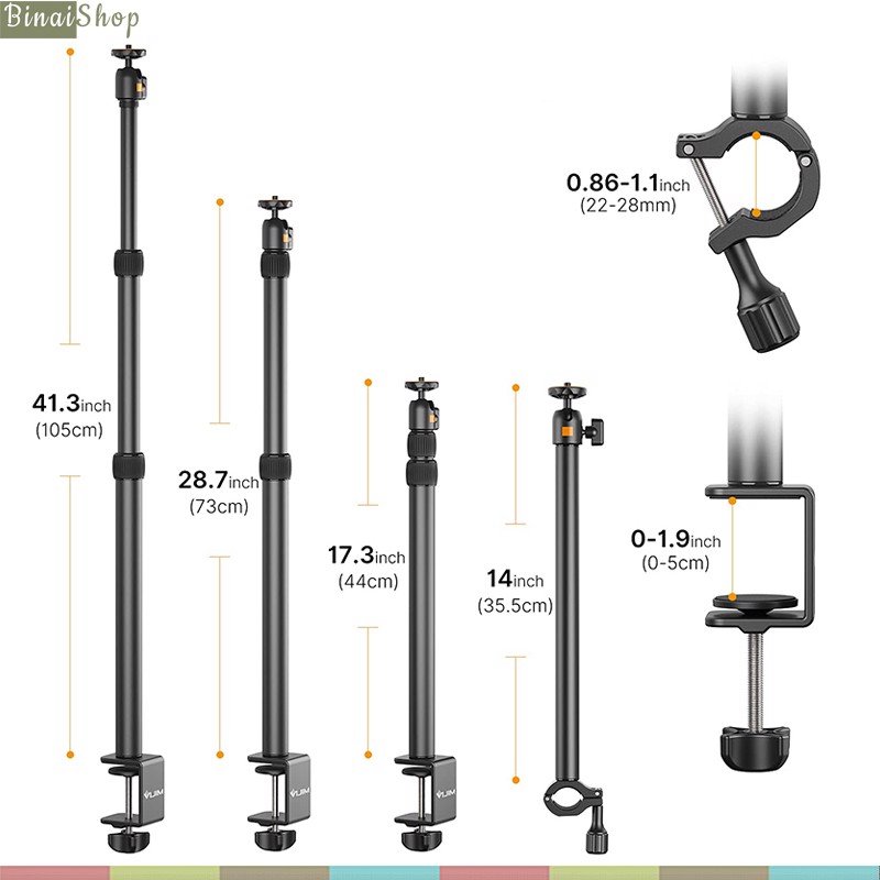 - Thanh chính có 3 mức chiều cao, tối đa là 105cm, phần kẹp mở rộng tối đa 8cm, tương thích hầu hết các mặt bàn phổ thông hiện nay, ball head xoay 360 độ, có thể tháo rời.