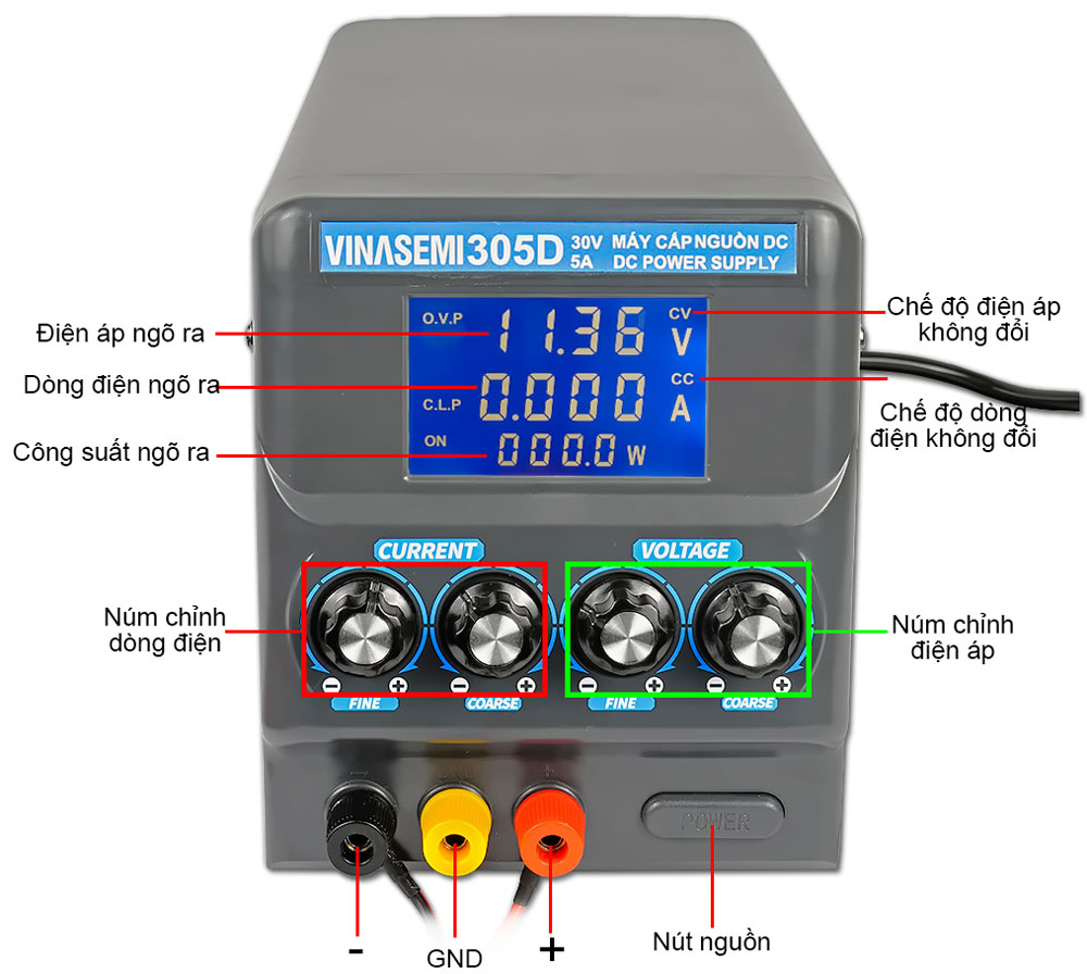 Vinasemi 305D là một máy cung cấp nguồn điện DC có độ chính xác cao với đầu ra có thể điều chỉnh được. Điện áp đầu ra có thể được điều chỉnh từ 0 đến 30VDC, dòng điện đầu ra có thể được điều chỉnh từ 0 đến 5A. Dòng điện, điện áp và công suất được hiển thị trên màn hình LCD sắc nét.
