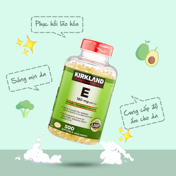 - Vitamin E Mỹ Kirkland Signature Vitamin E 180mg (400 IU) 500 Viên giúp điều trị và duy trì sức khỏe và làm đẹp da và tăng cường sức khỏe, hỗ trợ sức khỏe của hệ tuần hoàn qua việc ngăn ngừa quá trình oxi hóa cholesterol LDL, các tình trạng gây tổn thương tế bào.