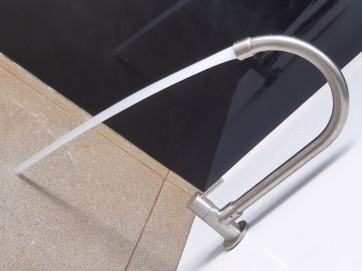 Ống tròn với cần lò xo linh đông với chiều dài lên tới 590mm, giúp vòi cao ráo và dòng chảy mạnh mẽ.
