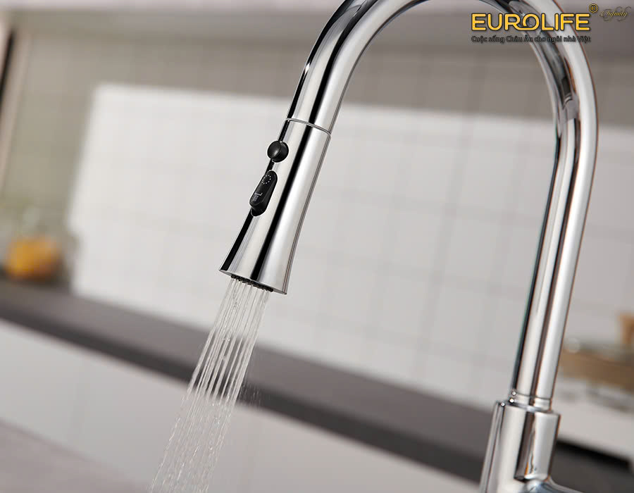 Vòi rửa chén nóng lạnh dây kéo 4 chức năng sử dụng Eurolife EL-IK01,02,03 (3 màu: trắng bạc, vàng, xám)