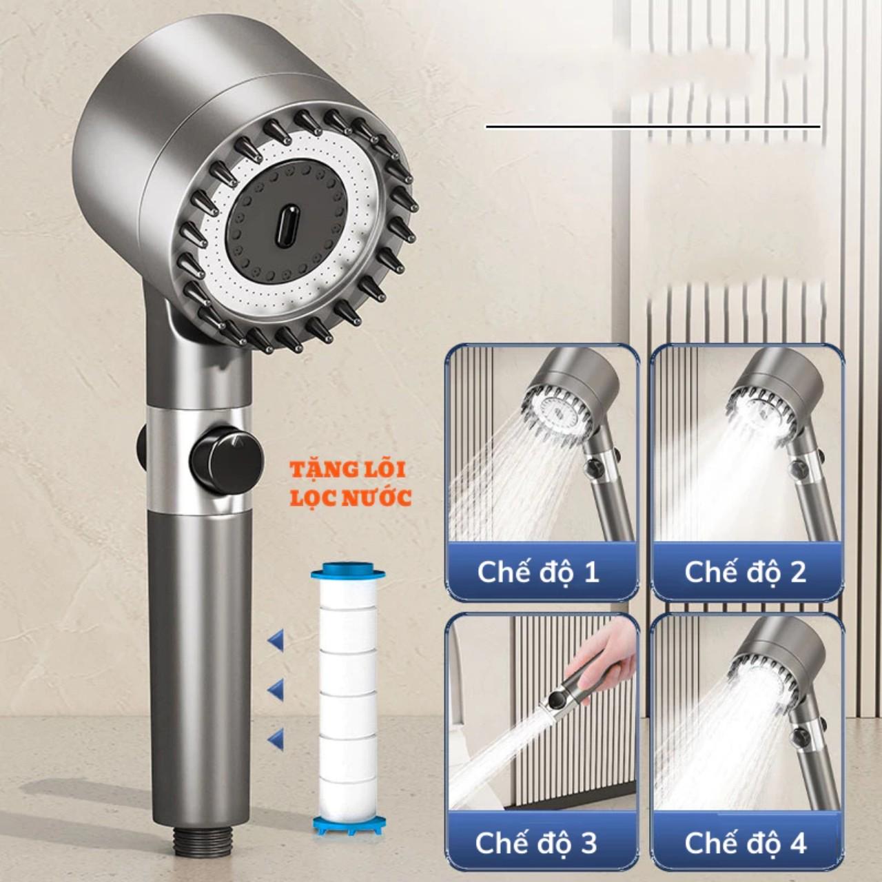 Vòi Sen Tăng Áp Đầu Vòi Hoa Sen Mát Xa 4in1 . Có 3 Chế Độ Áp Suất Cao Tiết Kiệm Nước Kèm Lõi Cotton Lọc Cho Nhà Tắm