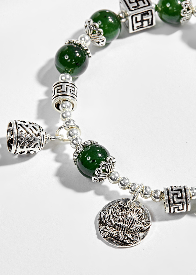 Vòng tay ngọc bích phối charm hoa sen (10mm) có tác dụng mang đến vận may, giúp người đeo tránh được những rủi ro, các thế lực tà ma và sự nguy hiểm.