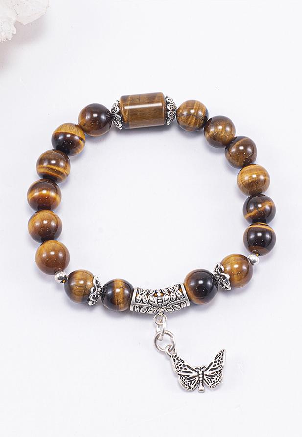 Vòng Tay Phong Thủy Nữ Đá Mắt Hổ Vàng Nâu Phối Charm Bướm Bạc (8mm) Mệnh Thổ, Kim