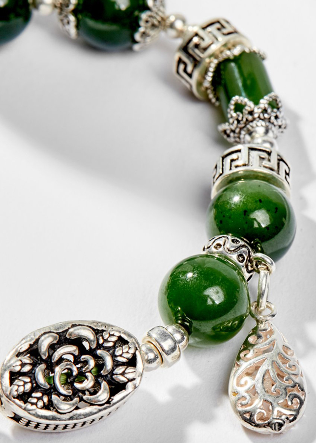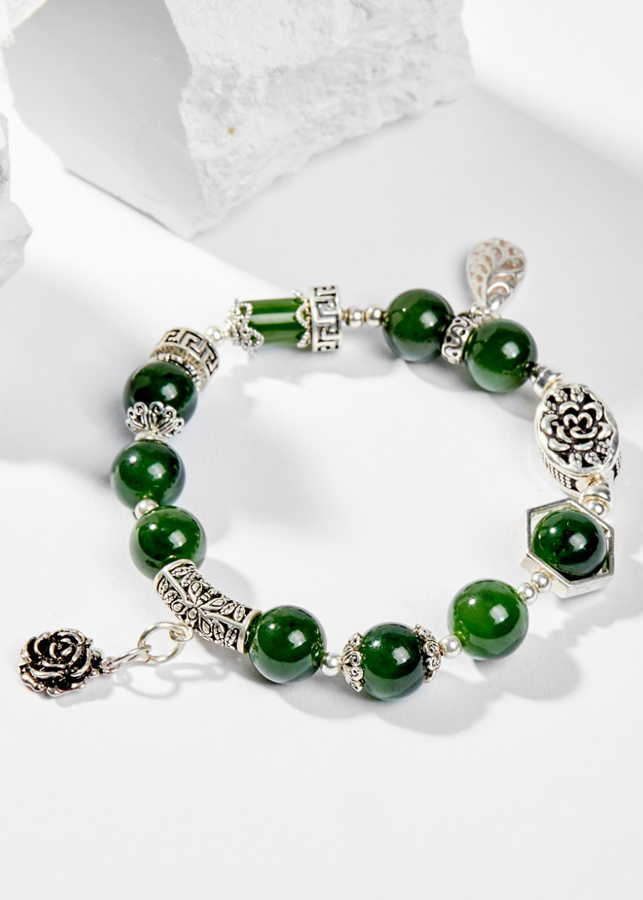 Vòng Tay Phong Thủy Nữ Đá Ngọc Bích Phối Charm Hoa Bạc (10mm) Mệnh Mộc, Hỏa