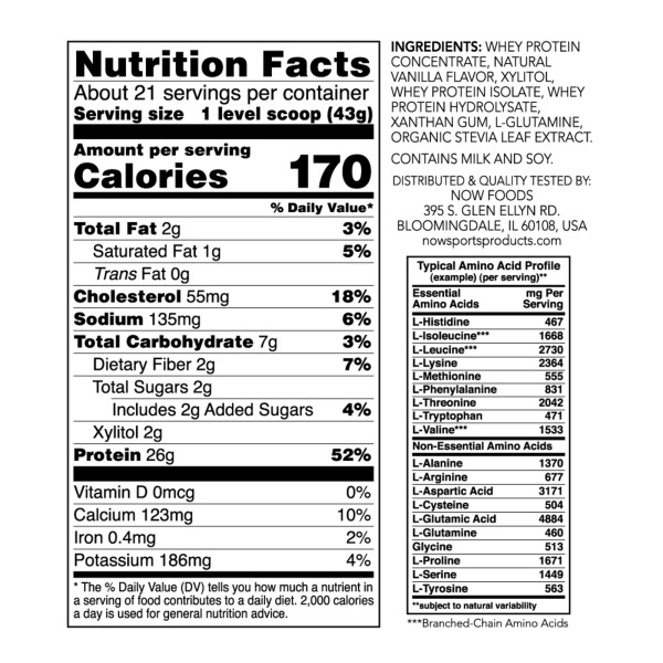 Thành phần: Whey Protein Concentrate, Hương Vani Tự Nhiên, Xylitol, Whey Protein Isolate, Whey Protein Hydrolyzate, Xanthan Gum, L-Glutamine, Chiết Xuất Lá Stevia Hữu Cơ. Chứa Sữa Và Đậu Nành. NOW Whey Protein - Bổ