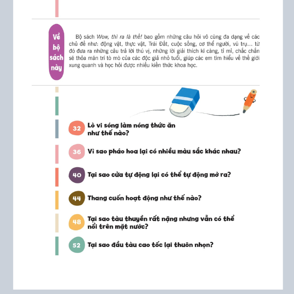 Wow, thì ra là thế! mang đến những lời giải đáp thú vị và bất ngờ như tên gọi của nó. Bộ sách với 9 chủ đề gây tò mò, mỗi tập truyện là rất nhiều câu hỏi, kèm với câu đố vui và giải thích chi tiết khoa học: