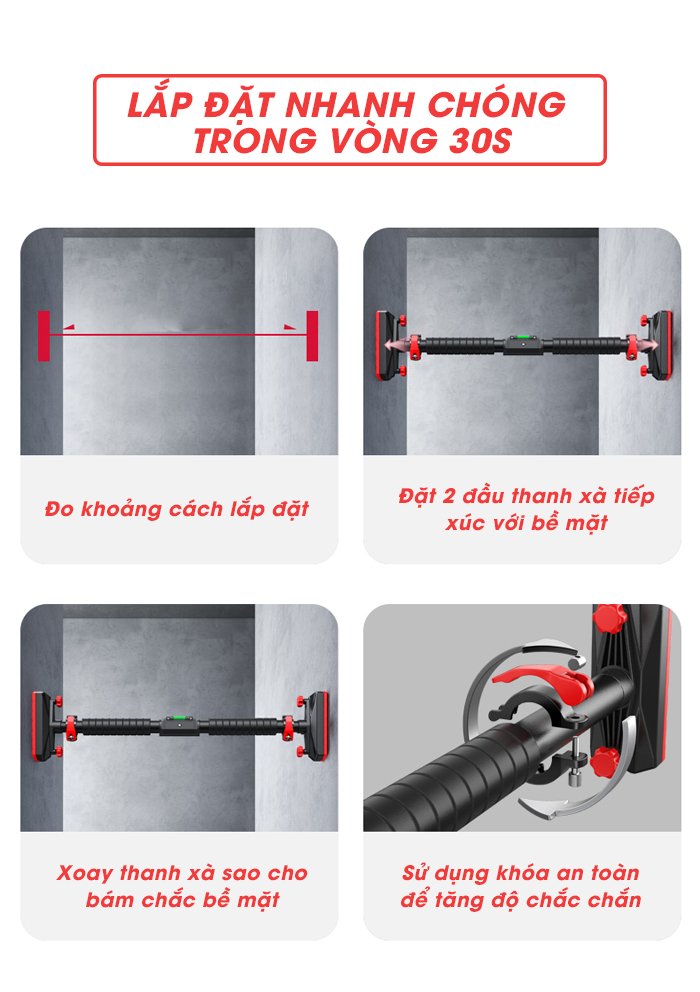 Mô Tả Sản Phẩm: Xà đơn gắn cửa treo tường Thăng Bằng có khóa chống xoay + Nivo cân bằng xà THANH TẬP XÀ ĐƠN TREO TƯỜNG THĂNG BẰNG - Màu sắc: Đen + đỏ.