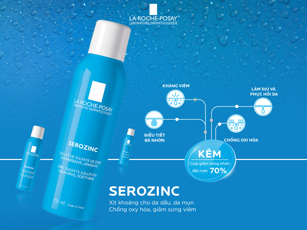 Mua tại TiktokChứa kẽm điều tiết bã nhờn Giảm bóng nhờn đến hơn 70% Chống oxy hóa Giảm sưng viêm Làm dịu da Dành cho da dầu mụn Xuất xứ nhập khẩu từ Pháp Bao bì sản phẩm có thể thay đổi theo từng đợt nhập hàng Xịt Khoáng Giúp Làm Sạch Và Dịu Da La Roche-Posay Serozinc (150ml) dành riêng cho da dầu, da mụn chứa thành phần Kẽm (Zinc) có tác dụng chống oxy hóa, điều tiết bã nhờn, giảm sưng viêm, làm dịu và phục hồi da.
