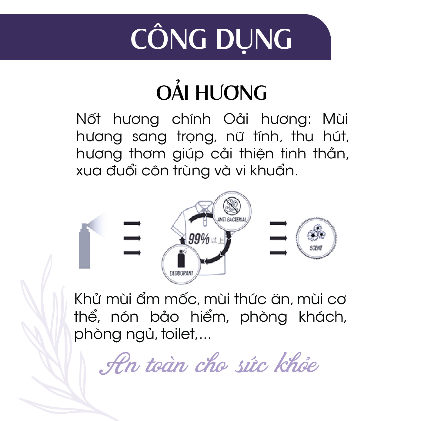 - Với thành phần hỗn hợp từ các tinh dầu thiên nhiên hữu cơ. Nốt hương chính Oải hương: Mùi hương sang trọng, nữ tính, thu hút, hương thơm giúp cải thiện tinh thần, xua đuổi côn trùng và vi khuẩn.