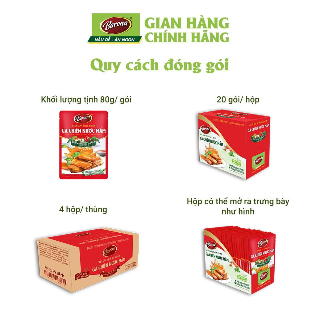 XỐT GIA VỊ HOÀN CHỈNH BARONA GÀ CHIÊN NƯỚC MẮM 80G Xốt Gia Vị Hoàn Chỉnh Barona là công thức phối trộn độc đáo giữa CHIẾT XUẤT RAU CỦ QUẢ TƯƠI như tỏi, ớt, hành lá…cùng các loại gia vị t...