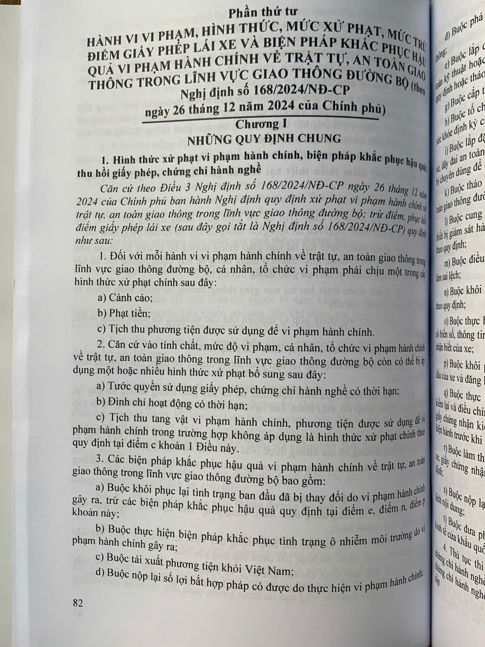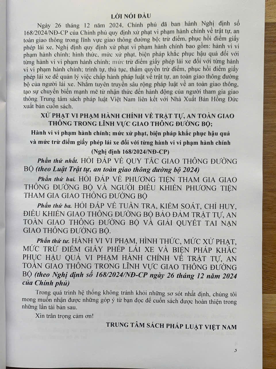 Ngày 26 tháng 12 năm 2024, Chính phủ đã ban hành Nghị định số 168/2024/NĐ-CP của Chính phủ quy định xử phạt vi phạm hành chính về trật tự, an toàn giao thông trong lĩnh vực giao thông đường bộ; trừ điểm, phục hồi điểm giấy phép lái xe. Nghị định quy định xử phạt vi phạm hành chính bao gồm: hành vi vi phạm hành chính; hình thức, mức xử phạt, biện pháp khắc phục hậu quả đối với từng hành vi vi phạm hành chính; mức trừ điểm giấy phép lái xe đối với từng hành vi vi phạm hành chính; trình tự, thủ tục, thẩm quyền trừ điểm, phục hồi điểm giấy phép lái xe để quản lý việc chấp hành pháp luật về trật tự, an toàn giao thông đường bộ của người lái xe. Nhằm tuyên truyền sâu rộng pháp luật về an toàn giao thông, tạo sự chuyển biến mạnh mẽ từ nhận thức đến hành động của người tham gia giao thông Nhà Xuất Bản Hồng Đức xuất bản cuốn sách.