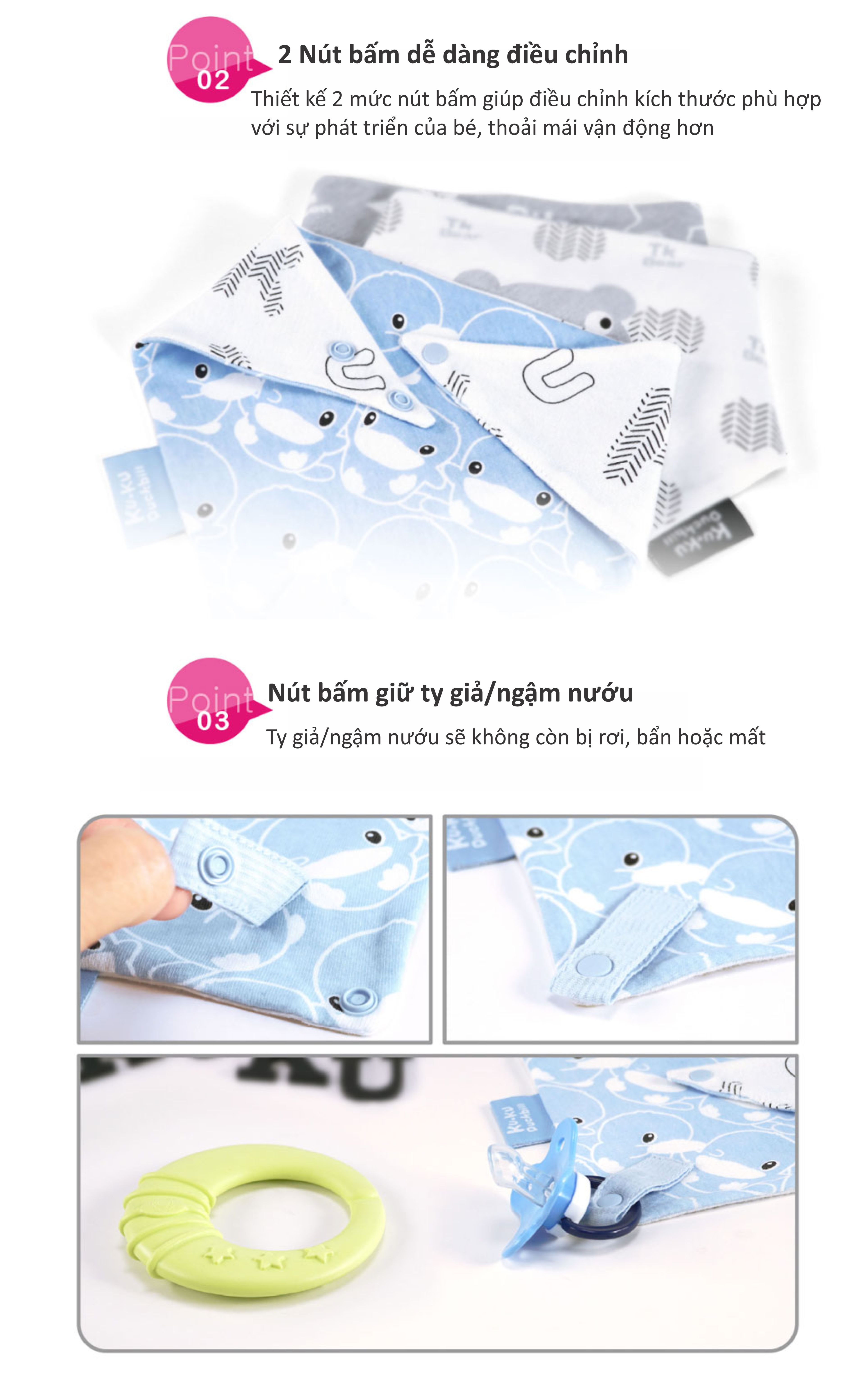 - Thiết kế 2 mức nút bấm phía sau, có thể điều chỉnh kích thước vừa vặn vòng cổ cho bé luôn thoải mái khi mang; - Chất vải cotton mềm mịn, an toàn với