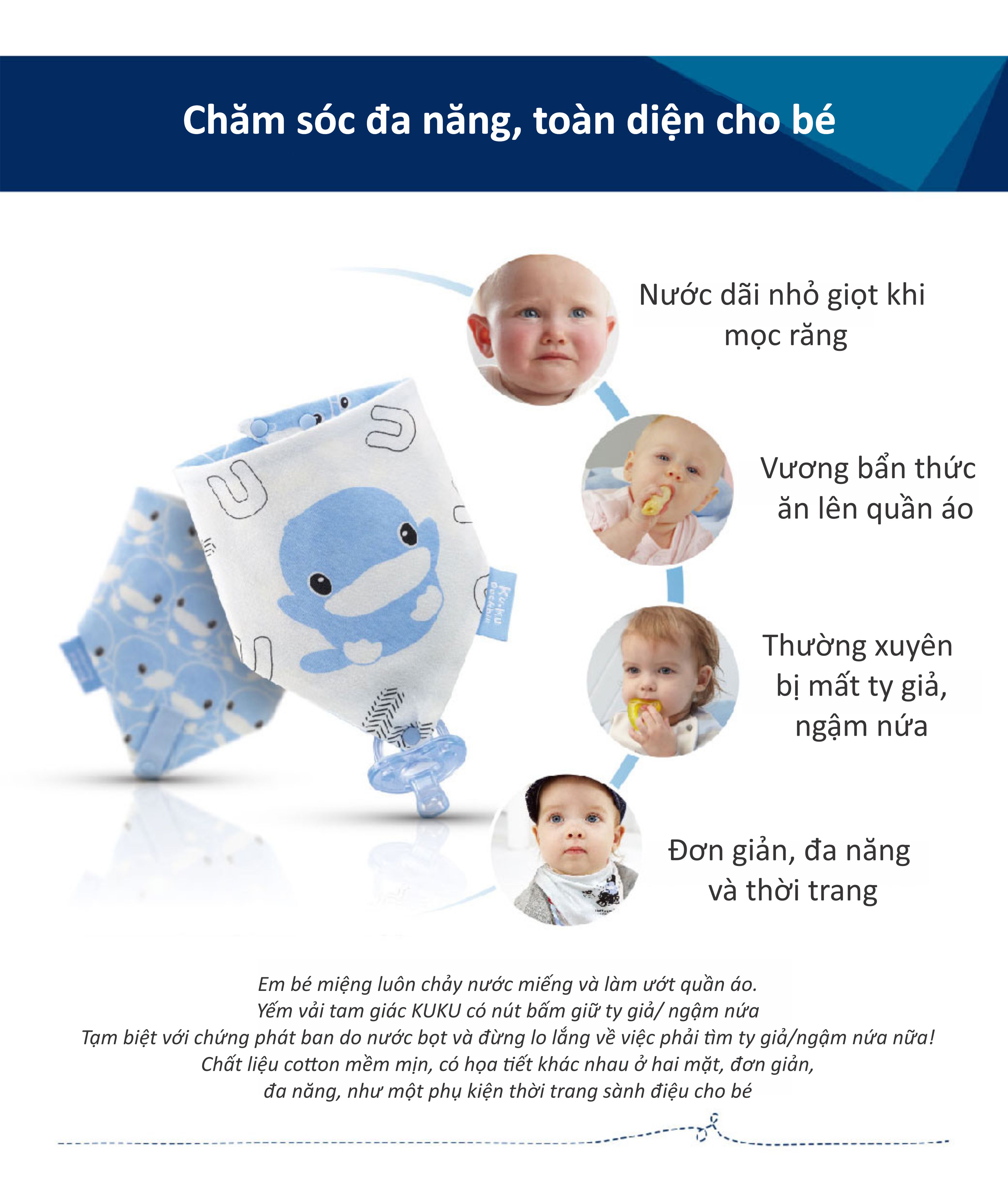 Yếm Cho Bé Bằng Vải KuKu KU2235 được thiết kế gài với nút bấm cố định chắc chắn vào người bé, cho con thoải mái ăn uống mà không sợ lẩm bẩn thức ăn. Yếm KU2235 được cắt may