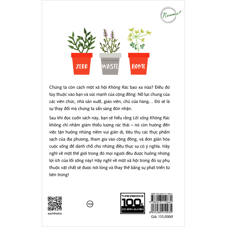 Zero Waste Home: Nhà Không Rác sẽ tiếp động lực giúp bạn giải tán bớt đồ đạc và tái chế ít hơn, không chỉ góp phần xây dựng một môi trường xanh sạch đẹp hơn mà còn giúp bạn hoàn thiện bản thân. Cuốn sách đưa ra những giải pháp thực tiễn cũng như đã được kiểm chứng để sống lành mạnh và phong phú hơn bằng các tài nguyên không sinh rác thải vốn sẵn có. Quy trình thực hiện chỉ đơn giản theo thứ tự: Refuse (từ chối những gì chúng ta không cần), Reduce (tiết giảm những gì chúng ta cần), Reuse (tái sử dụng những gì chúng ta tiêu thụ), Recycle (tái chế những gì chúng ta không thể từ chối, không thể tiết giảm, hoặc không thể tái sử dụng) và Rot (ủ phân những gì còn lại).