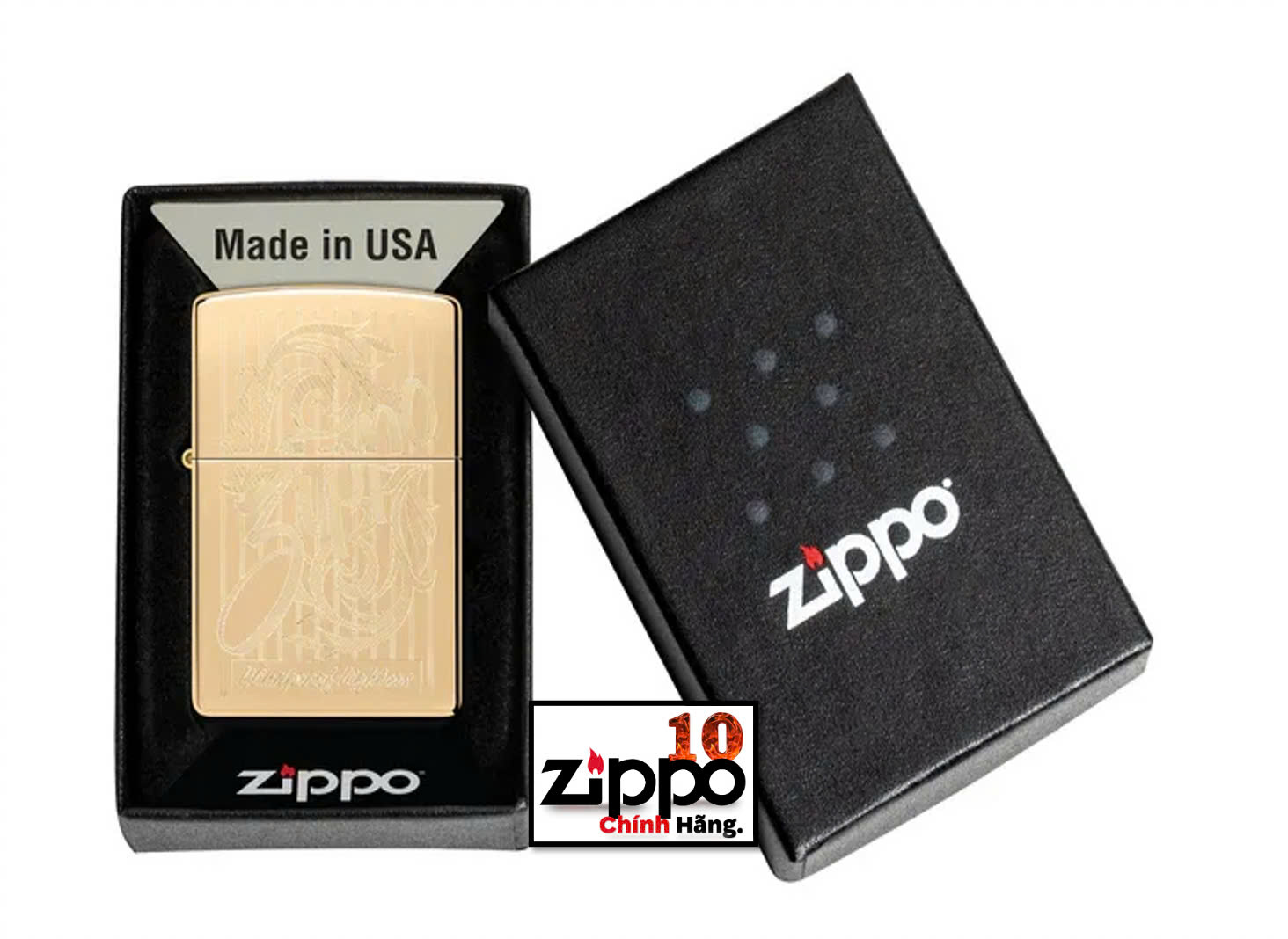 Một con rồng Châu Á truyền thống chỉ huy mọi mặt của chiếc bật lửa cổ điển High Polish Black này trong thiết kế Photo Image 360° phức tạp. Được đóng gói trong hộp quà